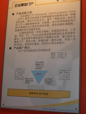 近日,中國(guó)電信在西安召開(kāi)了上半年市場(chǎng)工作會(huì)議暨新產(chǎn)品展示專題研討會(huì),在此次會(huì)議上,各省電信公司分別展示了自己面向市場(chǎng)開(kāi)發(fā)的新型業(yè)務(wù)。其中,來(lái)自浙江電信的一種叫企業(yè)通信門戶ECP(Enterprise Communications Portal)的主推業(yè)務(wù)在展示過(guò)程中吸引了眾多目光,引起了其他與會(huì)代表的關(guān)注,被認(rèn)為是中國(guó)電信拓展企業(yè)市場(chǎng)空間的最具潛力產(chǎn)品之一。