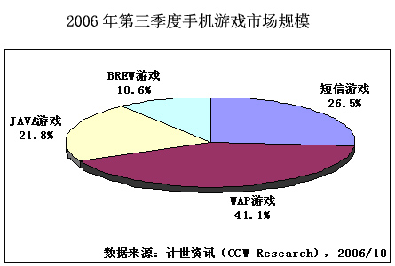 計(jì)世資訊(CCW Research)數(shù)據(jù)顯示,2006年第三季度中國手機(jī)游戲市場(chǎng)規(guī)模達(dá)到6.7億元人民幣,比第二季度增長(zhǎng)11.9%。 手機(jī)游戲市場(chǎng)規(guī)模包括移動(dòng)運(yùn)營商、手機(jī)游戲服務(wù)提供商在手機(jī)游戲業(yè)務(wù)上的總體收入,但不包括手機(jī)游戲軟件開發(fā)商的收入。第三季度,短信游戲增速繼續(xù)放緩,短信游戲市場(chǎng)規(guī)模達(dá)到1.8億元,占手機(jī)游戲市場(chǎng)份額的26.5%。WAP,JAVA和BREW游戲繼續(xù)保持快速增長(zhǎng),第三季度WAP、JAVA和BREW游戲市場(chǎng)規(guī)模分別為2.8億元、1.4億元和0.7億元。