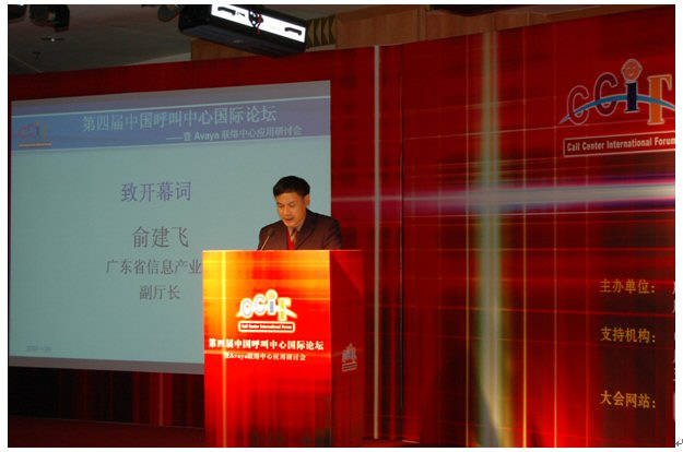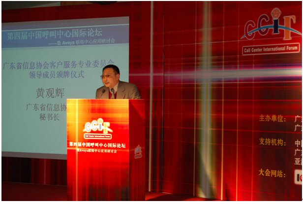 由廣東省信息協(xié)會、廣東省電子商務協(xié)會聯(lián)合主辦,廣東省信息協(xié)會客戶服務專業(yè)委員會、廣州市品派文化傳播有限公司策劃承辦,AVAYA公司總協(xié)辦的第四屆中國呼叫中心國際論壇于2007年1月23日在廣州亞洲國際大酒店隆重舉行,廣東省信息產(chǎn)業(yè)廳副廳長俞建飛出席會議并致開幕詞。會上,廣東省信息協(xié)會秘書長黃觀輝、AVAYA公司銷售總經(jīng)理楊晨、民生銀行電子銀行部華南運營中心總經(jīng)理李濤、網(wǎng)易客戶服務部總監(jiān)張云等分別做了主題發(fā)言。來自全國各地300多位企業(yè)管理人員參加了本次論壇。