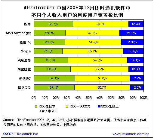根據(jù)iResearch艾瑞市場咨詢最新推出的網(wǎng)民連續(xù)用戶行為研究系統(tǒng)iUserTracker的最新數(shù)據(jù)表示,2006年12月,即時通訊軟件的月度總覆蓋用戶數(shù)為10183萬人,比2006年11月上升了0.8%,其中使用騰訊QQ的用戶最多,占94%,MSN Messenger排名第二,占35.6%,淘寶旺旺排名第三,占29%。在最近四個月內,即時通訊類軟件的月度總覆蓋用戶數(shù)總體保持增長。