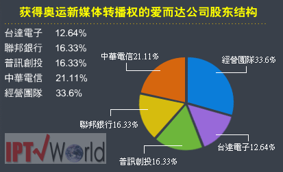 據(jù)IPTVWorld了解,2008年第29屆北京奧運(yùn)比賽轉(zhuǎn)播權(quán)臺(tái)灣區(qū)網(wǎng)絡(luò)與手機(jī)平臺(tái)轉(zhuǎn)播權(quán)。國(guó)際奧委會(huì) (IOC)除了證實(shí)這項(xiàng)消息,也表示,經(jīng)過度。另外,鑒于愛爾達(dá)在美國(guó)職棒等運(yùn)動(dòng)賽事和韓劇等數(shù)字內(nèi)容版權(quán)經(jīng)營(yíng)與后制服務(wù)擁有豐富的實(shí)務(wù)經(jīng)驗(yàn),中華電在今年4月進(jìn)一步以溢價(jià)參與愛爾達(dá)增資,取得21%的股權(quán),成為愛爾達(dá)除了經(jīng)營(yíng)團(tuán)隊(duì)外最大的股東。