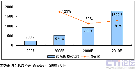 圖1 2007-2010年中國(guó)視頻應(yīng)用市場(chǎng)規(guī)模預(yù)測(cè)