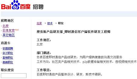 百度有意推IM產(chǎn)品的傳聞?dòng)蓙?lái)已久,不過(guò)該傳聞一直未得到官方證實(shí)。但在其官網(wǎng)最新公布的招聘頁(yè)面中,百度已向外界羅列出即時(shí)通信客戶(hù)端軟件研發(fā)工程師(搜索新產(chǎn)品研發(fā)部)、即時(shí)通信軟件產(chǎn)品經(jīng)理(客戶(hù)端軟件業(yè)務(wù)部)等職位,上述工作地點(diǎn)均在北京,可見(jiàn)百度的IM戰(zhàn)略布局已具雛形。