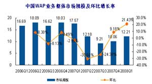 中國(guó)WAP業(yè)務(wù)整體市場(chǎng)規(guī)模及環(huán)比增長(zhǎng)率(來源:易觀國(guó)際)