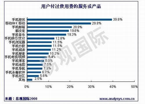 據(jù)易觀國際《中國手機應用市場用戶調(diào)研報告2008》研究發(fā)現(xiàn),用戶付過使用費的手機應用服務及產(chǎn)品中,手機游戲、移動IM和手機郵箱的比例較高。其中39.6%的手機應用用戶付費玩過手機游戲,29.8%的用戶曾經(jīng)為移動IM付費,而手機郵箱的付費用戶將達20%。其他手機應用產(chǎn)品或服務中,付費用戶的比例相當,均在10%左右,但是有近20%的用戶沒有用過任何的付費服務或產(chǎn)品。