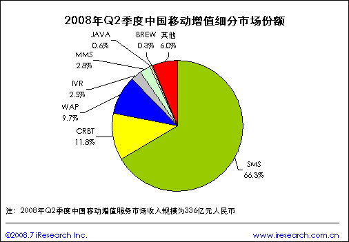 推薦本文根據(jù)艾瑞咨詢最新發(fā)布的《2008年第二季度中國 移動增值市場監(jiān)測報告》的相關數(shù)據(jù)顯示,08年第二季度中國移動增值服務市場的收入規(guī)模為336億元人民幣,其中傳統(tǒng)增值業(yè)務占據(jù)大部分市場份額,尤其是短信業(yè)務,在增值服務市場上的份額達到了66.3%.預計隨著電信業(yè)重組的逐步完成及3G新業(yè)務的推出將對增值服務市場的發(fā)展起到積極的推動作用,傳統(tǒng)短信業(yè)務的市場份額將會緩慢下降。