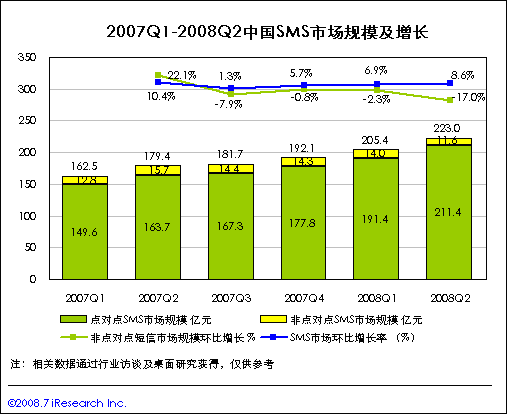 08年二季度中國SMS市場的收入規(guī)模為223億元,環(huán)比增長8.6%,同比增長24.3%,繼續(xù)保持平穩(wěn)增長。季度報告顯示,2008Q2中國非點對點短信業(yè)務收入規(guī)模僅為11.6億元,同比下滑26個百分點,環(huán)比下滑17%,非點對點業(yè)務嚴重下滑!