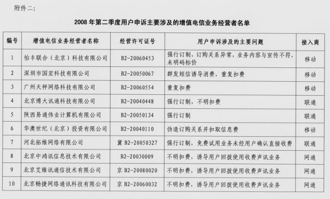 2.2008年二季度用戶(hù)申訴主要涉及的增值電信業(yè)務(wù)經(jīng)營(yíng)者名單