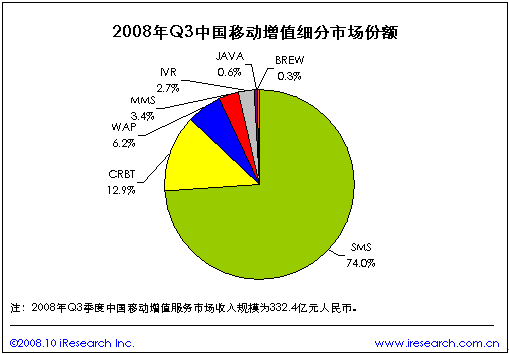 根據(jù)iResearch艾瑞咨詢最新出版的《2008年第三季度中國移動增值行業(yè)發(fā)展報告》數(shù)據(jù)顯示,2008年第三季度中國移動增值服務市場規(guī)模達332.4億元,同比增長40.2%.其中短信市場規(guī)模以74.0%的比例位居第一,CRBT和WAP分別以12.9%和6.2%的份額居第二、第三。