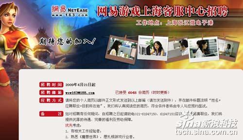網(wǎng)易表示,招聘將從2009年4月21日起正式開始,將提供優(yōu)厚的待遇、完善的福利及勞動(dòng)保障。截至21日0時(shí),該頁面顯示網(wǎng)易已接收到6048份簡歷。