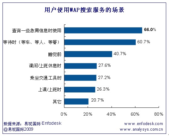 根據(jù)易觀Enfodesk《中國移動搜索市場用戶調(diào)研報告2009》研究發(fā)現(xiàn),用戶使用WAP搜索服務(wù),一般情況是在查詢一些急需信息和等待時(等車、等人、等餐),這兩類情形的使用比例均在60%以上。值得注意的是,在睡覺前,用戶使用移動搜索服務(wù)的比例達40.7%。而在其他休閑時間,如課間/上班休息時、乘坐交通工具、上課/上班時也是用戶經(jīng)常使用WAP搜索服務(wù)的場景。
