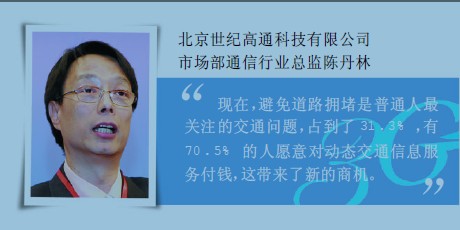 在北京世紀(jì)高通科技有限公司市場(chǎng)部通信行業(yè)總監(jiān)陳丹林看來,交通堵塞已經(jīng)成為現(xiàn)代都市的頑疾,而3G的到來給這一問題的解決帶來了新的思路。