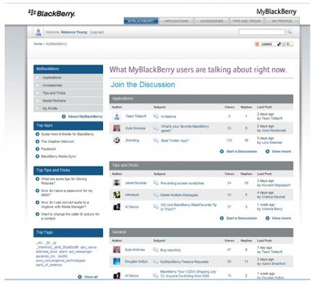 從某種程度而言,MyBlackBerry并不是一個(gè)真正的社交網(wǎng)站,而更像一個(gè)用戶留言板。網(wǎng)站具有一定的針對(duì)性,允許使用同型號(hào)設(shè)備的用戶進(jìn)行交流。例如,使用BlackBerry