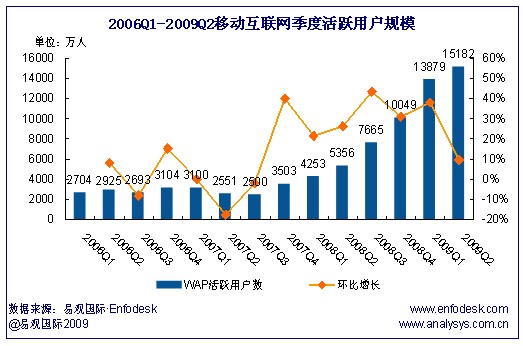 2009年第2季度中國移動(dòng)互聯(lián)網(wǎng)活躍用戶規(guī)模達(dá)1.52億