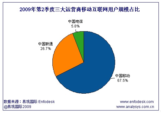 易觀國際(Analysys International)研究發(fā)現(xiàn),相比2009年第1季度,中國聯(lián)通、中國電信的移動(dòng)互聯(lián)網(wǎng)用戶規(guī)模占比都有小幅增長。尤其是中國電信,在2009年5月17日正式推出WAP業(yè)務(wù)并輔以豐富應(yīng)用,在某種程度上加速了中國電信移動(dòng)互聯(lián)網(wǎng)用戶規(guī)模的小幅攀升。
