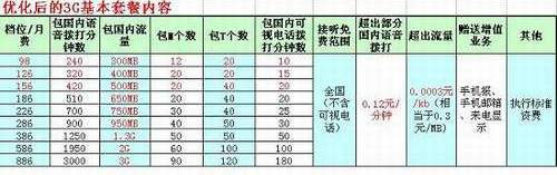 據(jù)了解,正式商用資費(fèi)包含9個(gè)等級(jí),從98元-886元不等,取消了試商用期間最高的1686元套餐,新增了98元、126元和156元三項(xiàng)套餐,超出套餐的語音資費(fèi)也由原來的0.36元-0.24元/分鐘不等,調(diào)整為統(tǒng)一的0.12元/分鐘,比之試商用期間的半價(jià)資費(fèi)還要低。