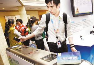 昨日,一位工作人員正在演示如何用手機檢票通過閘機。