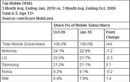3月11日消息,據(jù)國外媒體報(bào)道,全球IT信息服務(wù)提供商comScore公司最近發(fā)布了一項(xiàng)2009年第四季度(2009年10月至2010年1月)美國手機(jī)市場調(diào)查報(bào)告。這份報(bào)告對手機(jī)原配件生產(chǎn)商(OEMs)及智能手機(jī)操作系統(tǒng)平臺(tái)做了相關(guān)的行業(yè)排名,排名依據(jù)為美國市場13歲以上手機(jī)用戶群數(shù)據(jù)的統(tǒng)計(jì),以及用戶手機(jī)使用行為的調(diào)查數(shù)據(jù)。一月份報(bào)告顯示摩托羅拉以22.9%的市場份額占據(jù)了第一位。RIM公司則占據(jù)著智能手機(jī)市場43%的市場份額,競爭優(yōu)勢明顯。