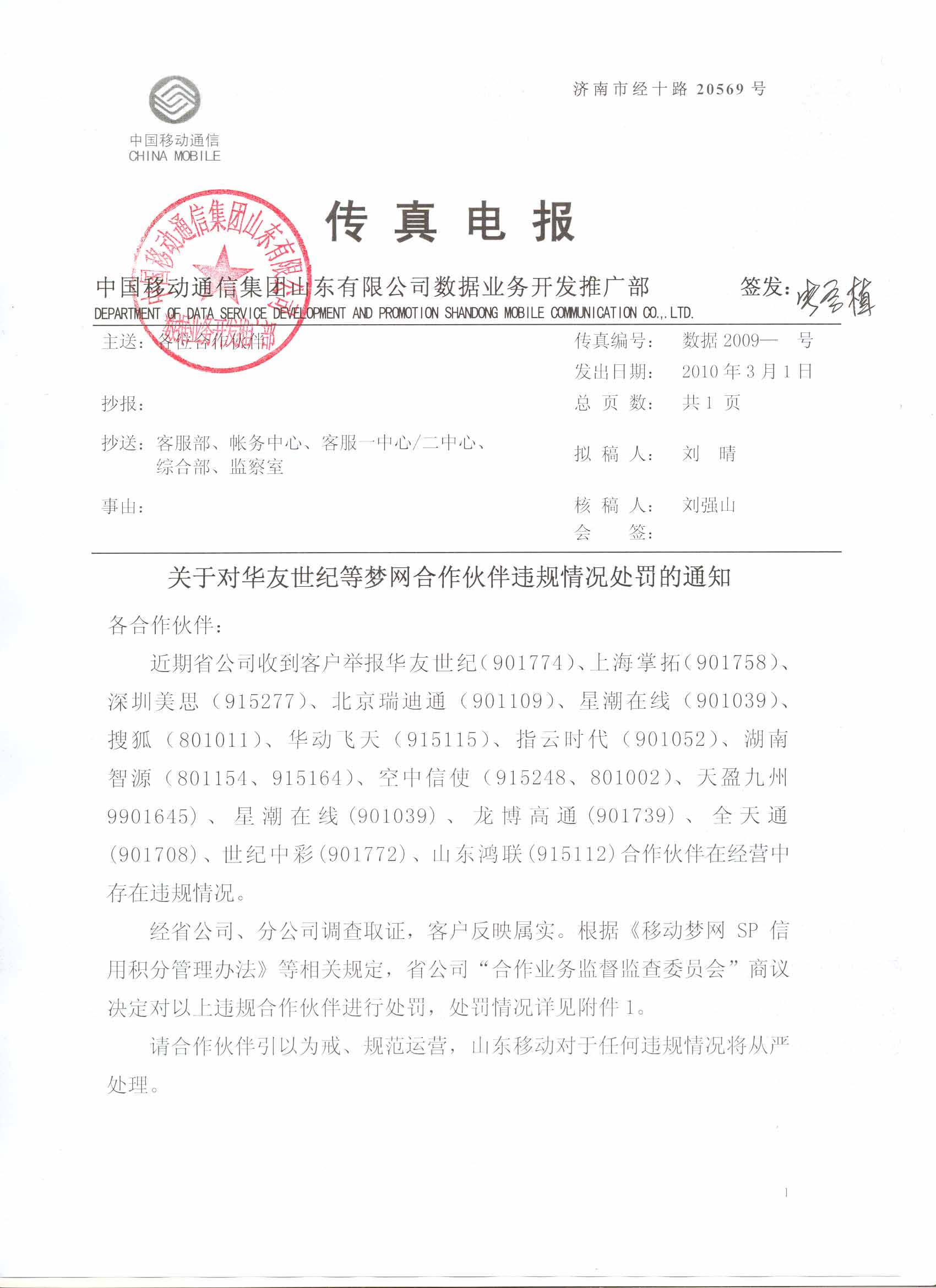 | 7 | 華動飛天 | 915115 | 10663333 | 該公司“圖片點播”業(yè)務,存在未經(jīng)許可隨意更改業(yè)務邏輯和內(nèi)容,影響用戶正常使用和服務。 | 暫停該公司“圖片點播”業(yè)務(業(yè)務代碼:TPC)在山東地區(qū)的服務1個月?鄢庞梅e分5分。 |