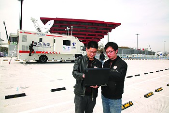 中國電信的應(yīng)急衛(wèi)星通信車抵達(dá)中國館,為世博會開幕護(hù)航。