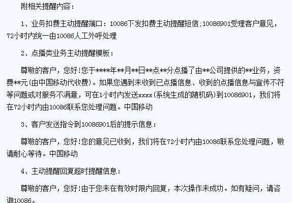 四川移動(dòng)表示,將于今天完成系統(tǒng)改造和上線點(diǎn)播類業(yè)務(wù)的扣費(fèi)主動(dòng)提醒功能。為此,四川移動(dòng)給各大SP廠商下達(dá)了通知,并附上了提醒內(nèi)容。從9月1日期,10086對(duì)于用戶開(kāi)通的業(yè)務(wù)將會(huì)下發(fā)扣費(fèi)主動(dòng)提醒短信。此外,中國(guó)移動(dòng)10086901將受理客戶意見(jiàn),在72小時(shí)內(nèi)統(tǒng)一由10086人工外呼處理。對(duì)于用戶開(kāi)通的點(diǎn)播類業(yè)務(wù),中國(guó)移動(dòng)設(shè)置了“點(diǎn)播類業(yè)務(wù)主動(dòng)提醒模板”不僅提醒用戶開(kāi)通了點(diǎn)播類業(yè)務(wù)還為用戶點(diǎn)播過(guò)程中出現(xiàn)的問(wèn)題給出了解決途徑。
