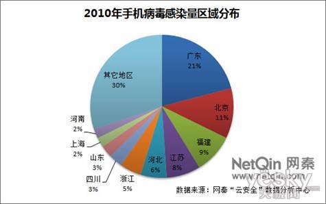 感染地域方面,《2010年中國(guó)大陸地區(qū)手機(jī)安全報(bào)告》指出,2011年我國(guó)廣東地區(qū)以21%的感染比例,成為手機(jī)病毒的感染重災(zāi)區(qū),北京,上海,福建、江蘇等地位居其后。沿海發(fā)達(dá)地區(qū),已成為手機(jī)病毒的感染重災(zāi)區(qū)。