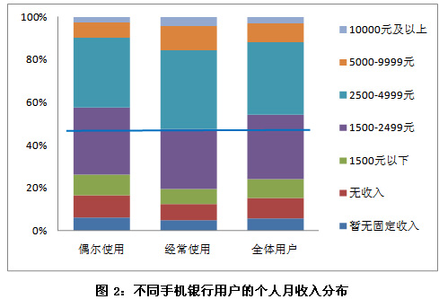 通過對(duì)不同手機(jī)銀行用戶的個(gè)人月收入分布可以看出,經(jīng)常使用手機(jī)銀行業(yè)務(wù)的用戶的個(gè)人月收入偏高,其中,個(gè)人月收入5000元以上的比例為15.4%,2500元以上的比例為52.2%,均高于偶爾使用手機(jī)銀行業(yè)務(wù)的用戶。事實(shí)上,經(jīng)常使用手機(jī)銀行業(yè)務(wù)的用戶由于收入偏高且手機(jī)銀行使用頻率高,必然成為手機(jī)銀行業(yè)務(wù)的核心客戶,這一較為富裕的目標(biāo)群體將在很大程度上促進(jìn)手機(jī)銀行業(yè)務(wù)的繁榮。