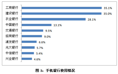 在對(duì)手機(jī)銀行用戶對(duì)手機(jī)銀行使用的情況分析來看,工商銀行(601398,股吧)手機(jī)銀行的使用率依然最高,達(dá)35.1%,建設(shè)銀行(601939,股吧)緊隨其后,為35.0%。通過進(jìn)一步的分析發(fā)現(xiàn),在經(jīng)常使用手機(jī)銀行的用戶中,對(duì)建設(shè)銀行手機(jī)銀行的使用率(37.4%)略高于對(duì)工商銀行的使用率(36.0%),這表明建設(shè)銀行的用戶相對(duì)養(yǎng)成了使用手機(jī)銀行的習(xí)慣。另外,農(nóng)業(yè)銀行(601288,股吧與中國(guó)銀行的使用率在這半年中都有顯著提升,不斷縮小與行業(yè)領(lǐng)跑者的差距。