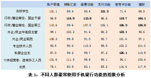 在本次調(diào)研中,對(duì)不同人群最常使用手機(jī)銀行功能的指數(shù)分析表明,在校學(xué)生更傾向于經(jīng)常使用手機(jī)銀行支付功能,較少使用手機(jī)理財(cái)功能;行政/事業(yè)單位、國(guó)企干部更傾向于使用手機(jī)銀行的轉(zhuǎn)賬匯款功能、繳費(fèi)功能、信用卡功能和理財(cái)功能,尤其是理財(cái)功能;行政/事業(yè)單位、國(guó)企職工經(jīng)常使用信用卡功能和理財(cái)功能的傾向性也非常明顯;外企/民企中高級(jí)主管則更傾向于經(jīng)常使用信用卡功能;私營(yíng)企業(yè)主經(jīng)常使用手機(jī)銀行信用卡功能的傾向性顯著。