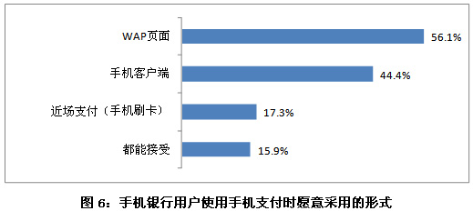 另外,手機(jī)銀行用戶使用手機(jī)支付時(shí),首選的是WAP頁(yè)面,56.1%的用戶更愿意采用這種形式。其次是手機(jī)客戶端,其比例為44.4%。近場(chǎng)支付(手機(jī)刷卡)這樣支付形式較為新穎,愿意使用的用戶比例僅占17.3%。此外,有15.9%的人以上三種方式都能接受。