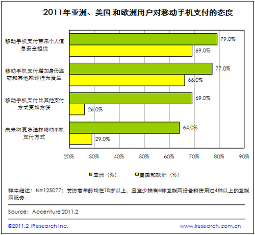 iResearch艾瑞咨詢根據Accenture的研究調查數據發(fā)現(xiàn),移動手機支付安全問題受到全球用戶的普遍關心。根據2011年Accenture對亞洲、美國以及歐洲125077位手機用戶進行的網上調查顯示,亞洲79%的受訪者擔心移動手機支付帶來的個人信息安全隱患,77%的受訪者擔心身份盜竊和其他欺詐行為的發(fā)生;美國和歐洲擔心以上安全問題的用戶也分別占到69%和66%。