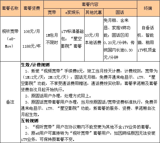 尊享e8套餐適用于對(duì)家庭上網(wǎng)時(shí)長(zhǎng)及速度要求很高,固話使用量較大,有iTV需求的家庭客戶,分為168/月和208元/月兩檔。