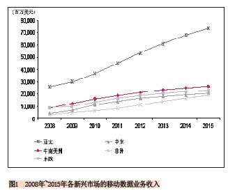 就絕對值來看亞太地區(qū)的新興市場將占主導(dǎo)地位,該地區(qū)的移動數(shù)據(jù)業(yè)務(wù)收入將從2010年的368億美元增長到2015年的734億美元,增長率幾乎為100%。給出這么高的預(yù)測值不足為奇,因為該市場上有中國、印度、印尼“三大巨頭”,這三個國家對該區(qū)域數(shù)據(jù)業(yè)務(wù)收入的貢獻(xiàn)將達(dá)到81%。
