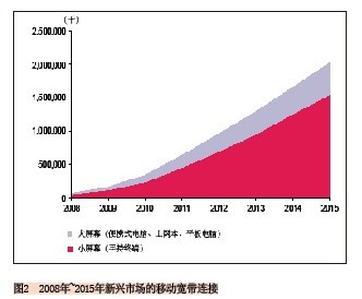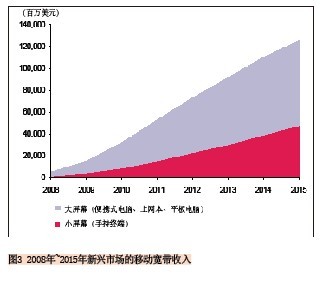 另外一個預(yù)測也可說明這一趨勢:2010年到2015年小屏幕移動寬帶連接的復(fù)合年均增長率為45%,而大屏幕的復(fù)合年均增長率為36%,到2015年新興市場上將有16億的小屏幕連接和近4.59億的大屏幕連接。