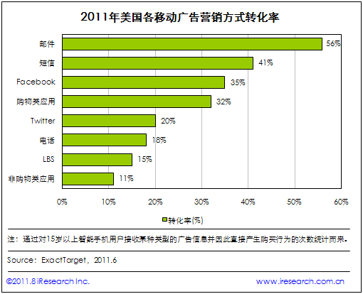 iResearch艾瑞咨詢(xún)整理ExactTarget調(diào)研數(shù)據(jù)時(shí)發(fā)現(xiàn):2011年在驅(qū)動(dòng)美國(guó)手機(jī)用戶產(chǎn)生購(gòu)買(mǎi)的移動(dòng)廣告營(yíng)銷(xiāo)方式中,電子郵件營(yíng)銷(xiāo)的轉(zhuǎn)化率最高,達(dá)到56%,短信、Facebook、購(gòu)物類(lèi)手機(jī)應(yīng)用(如Amazon、eBay、Groupon)以41%、35%、32%的轉(zhuǎn)化率依次位居二、三、四位。