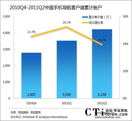 2011年Q2中國(guó)手機(jī)導(dǎo)航客戶端累計(jì)帳戶達(dá)4238萬