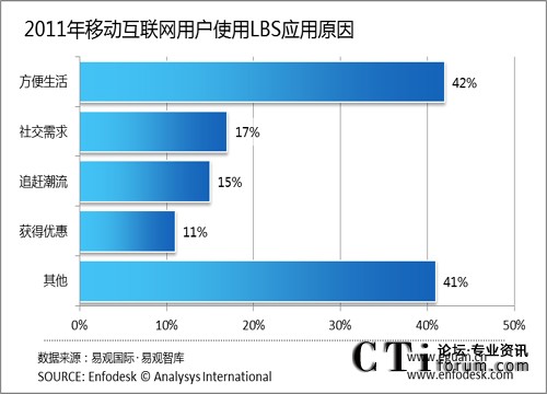 CTI論壇(ctiforum)8月26日消息(記者 張潔):根據(jù)易觀國際(Analysys international)最新調(diào)研顯示,42%的使用LBS用戶認(rèn)為使用應(yīng)用程序可以方便生活,17%的用戶認(rèn)為是社交需求,15%的用戶只是出于追趕潮流的目的,11%的用戶認(rèn)為使用LBS應(yīng)用程序可以獲得一定的優(yōu)惠。