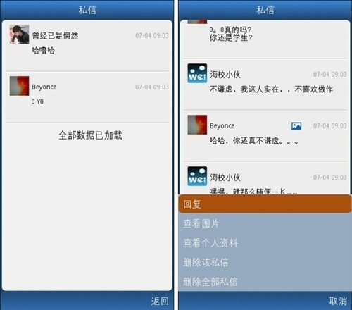 武俠小說中每每寫到傳音時,都愛這樣寫“不世高人傳音入密……”。這不世高人的稱號可是讓人夢寐以求啊。語音微博1.6 for Symbian最新加入的私信功能助你一償夙愿。每每查看其他用戶以及他的語音微博時,你都可以看到私信按鈕,點擊即可發(fā)送私信。傳音入密就是這樣簡單。當(dāng)然,除了語音,你也可以傳送文字,很貼心有木有。