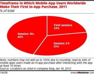 移動(dòng)應(yīng)用分析公司Localytics提供的數(shù)據(jù)顯示,增加應(yīng)用粘性對(duì)用戶重復(fù)訪問(wèn)應(yīng)用以及經(jīng)常性參與應(yīng)用內(nèi)置支付非常重要。舉例而言,連續(xù)數(shù)天玩一款手機(jī)游戲的玩家,比不經(jīng)常玩這款游戲的玩家更可能購(gòu)買游戲附加的內(nèi)容或功能。Localytics的研究結(jié)果表明,忠實(shí)的應(yīng)用用戶比平均用戶使用應(yīng)用內(nèi)置支付高出25%。Localytics的數(shù)據(jù)還表明,44%的智能手機(jī)用戶只有與應(yīng)用互動(dòng)10次以上,才會(huì)使用應(yīng)用內(nèi)置支付。該調(diào)查還顯示,在應(yīng)用發(fā)布12天開始,便會(huì)有用戶使用應(yīng)用內(nèi)置支付。