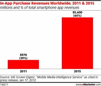IHS Screen Digest預(yù)計(jì),應(yīng)用內(nèi)置支付將成為移動(dòng)應(yīng)用營(yíng)收的新標(biāo)準(zhǔn)。游戲開發(fā)商共同通過(guò)向用戶提供免費(fèi)應(yīng)用下載服務(wù),然后向用戶進(jìn)入新層次內(nèi)容收取費(fèi)用已證明這種“免費(fèi)增值”模式非常的成功。IHS Screen Digest預(yù)計(jì),到2015年,應(yīng)用內(nèi)置支付將占據(jù)智能手機(jī)應(yīng)用營(yíng)收總額的64%,遠(yuǎn)超過(guò)2011年的39%。