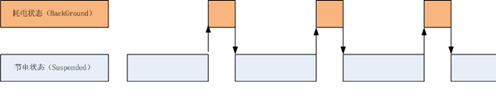 2、程序配置用于 VOIP 業(yè)務(wù)的網(wǎng)絡(luò)連接(Socket),告知系統(tǒng),在程序進(jìn)程被調(diào)度到“掛起(Suspended)”狀態(tài)時(shí)該特殊的網(wǎng)絡(luò)連接需要被系統(tǒng)接管,因此,此時(shí)網(wǎng)絡(luò)連接仍然是活動(dòng)的。當(dāng)網(wǎng)絡(luò)連接有新的數(shù)據(jù)到達(dá)的時(shí)候,程序?qū)摹皰炱穑⊿uspended)” 狀態(tài)被喚醒到“后臺(tái) (Background)”狀態(tài),如果是個(gè)來(lái)電事件,VOIP應(yīng)用則發(fā)起一個(gè)本地提醒事件,此時(shí)用戶(hù)可以在設(shè)備的界面上看到來(lái)電提醒,如果用戶(hù)選擇接聽(tīng)來(lái)電,則 VOIP 應(yīng)用被調(diào)度到前端的“活動(dòng) (Active)”狀態(tài)直接與用戶(hù)交互,否則,回退到低電的“掛起(Suspended)”狀態(tài)。下圖可以看到左圖是傳統(tǒng)的 VOIP 應(yīng)用,在“待機(jī)”狀態(tài)下整個(gè)程序都運(yùn)行在耗電的“后臺(tái) (Background)”狀態(tài),右圖是蘋(píng)果的 VOIP 實(shí)現(xiàn),僅僅網(wǎng)絡(luò)連接運(yùn)行在耗電的“后臺(tái) (Background)”狀態(tài)。其余系統(tǒng)部分運(yùn)行在低電的“掛起(Suspended)”狀態(tài)。