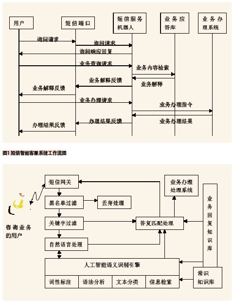 通過自然語言與用戶交互時,降低短信自助服務的使用門檻,讓所有用戶都能輕易使用。這就要求提供短信服務的計算機系統(tǒng)具有將自然語言系統(tǒng)轉(zhuǎn)換為計算機程序能夠處理的形式,并且能將處理結果轉(zhuǎn)換回自然語言系統(tǒng)。在自然語言處理技術中,通過特定的計算機程序?qū)Χ绦虐l(fā)來的自然語言進行詞性標注、語法分析、文本分類、信息檢索匹配等一系列處理判斷出用戶的請求意圖,再根據(jù)信息檢索匹配預置的回復結果以短信形式反饋給用戶。