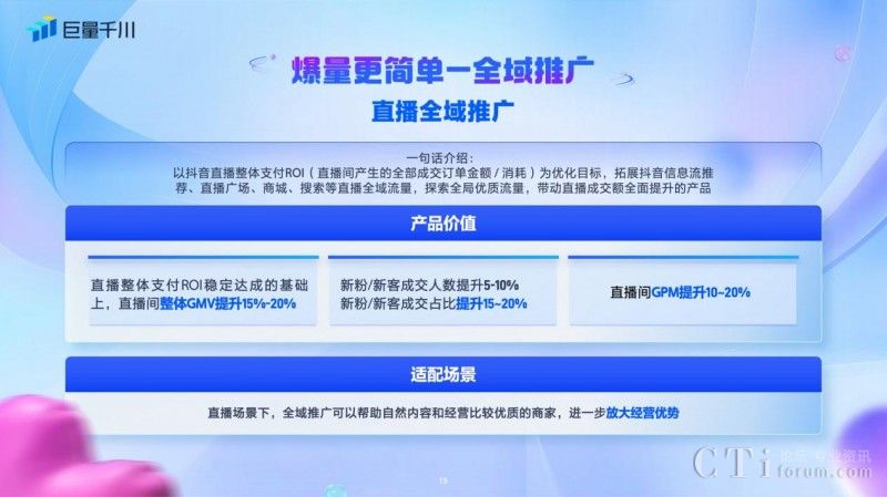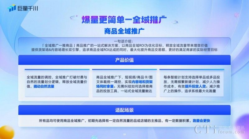 此外,商品全域推廣為商品推廣提供一站式解決方案,是以商品全域ROI為優(yōu)化目標,釋放全域流量帶來的增效價值,提供貨架場、內容場增長雙引擎,幫助客戶在追求商品全域ROI達成的同時,最大化提升商品交易額,更好的滿足客戶的實際經(jīng)營目標。在商品全域推廣下,短視頻/商品卡/圖文體裁統(tǒng)一調控,無需糾結選擇推廣商品的投放工具,一站式全域流量觸達。