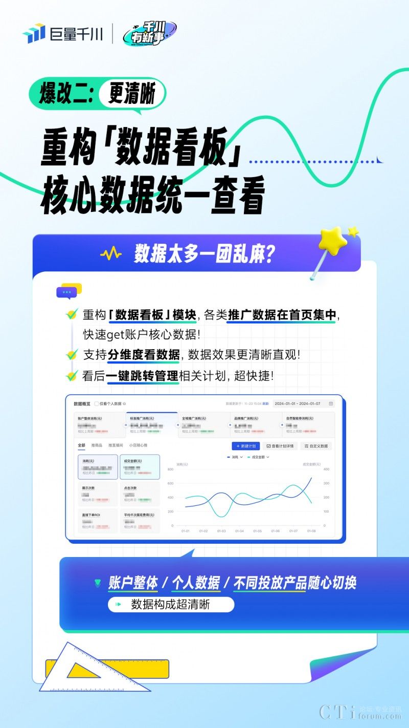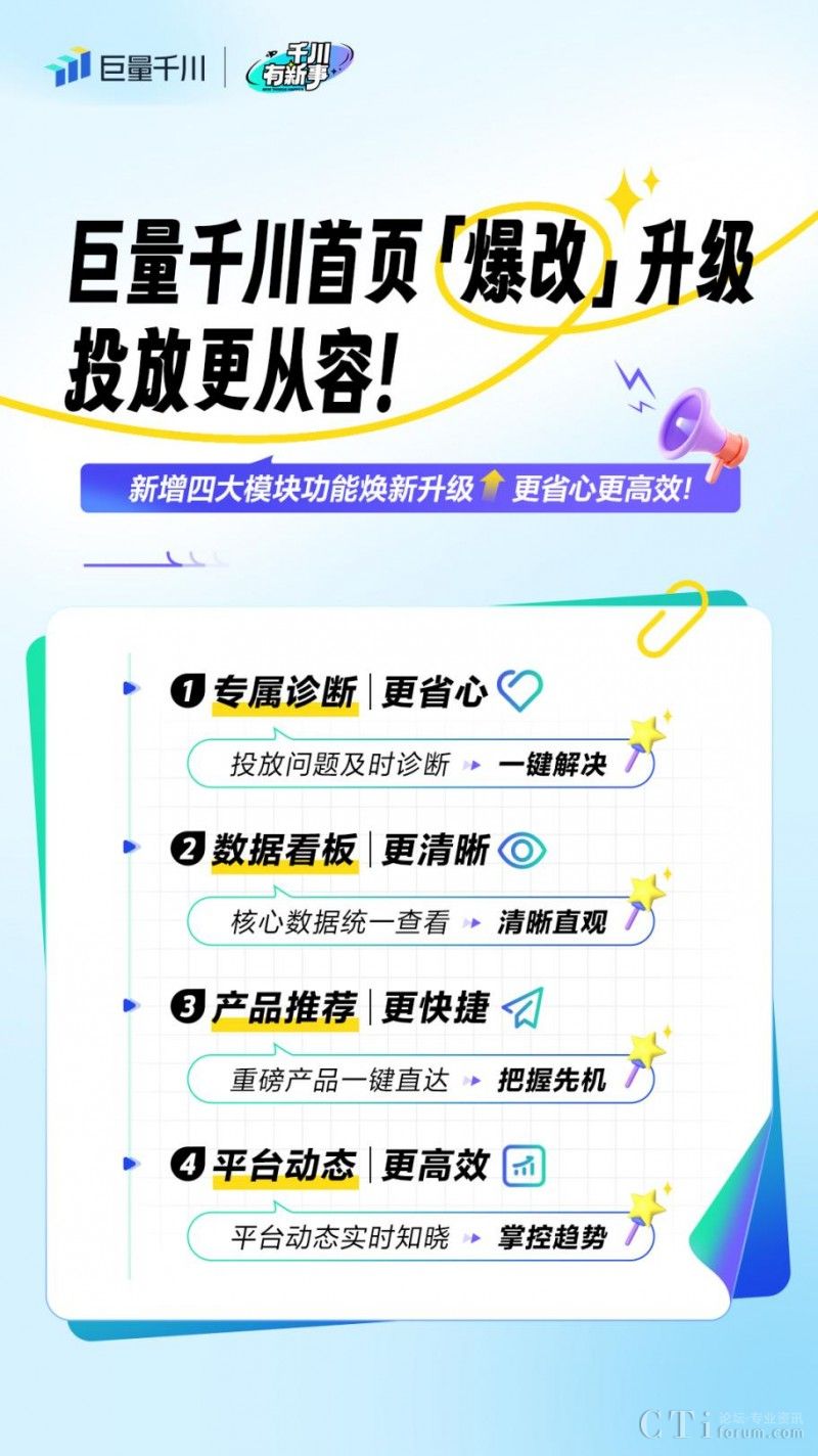 近期,為直面商家投放困境,全面提升投放效率,巨量千川PC端首頁全新推出四大重磅升級——上線「專屬診斷建議」、「數(shù)據(jù)看板」、「重磅產(chǎn)品推薦」和「平臺動態(tài)」,助力商家更便捷、更從容地提升投放質(zhì)量和效果,高效推動生意增長!