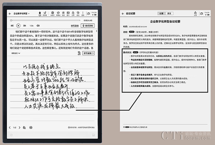 其中會(huì)議紀(jì)要功能,可將科大訊飛智能辦公本的語(yǔ)音實(shí)時(shí)轉(zhuǎn)寫功能與墨水屏紙感書寫相結(jié)合,并且可以對(duì)會(huì)議記錄內(nèi)容形成一份精簡(jiǎn)的會(huì)議紀(jì)要,有助于快速回溯會(huì)議內(nèi)容。