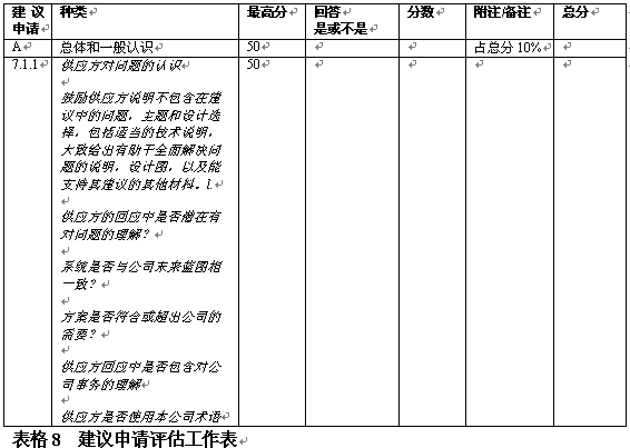 。。在決定了初步要求之后,評估小組應(yīng)具體地開展評估工作。具體評估的目標(biāo)是通過給建議書主要方面打分作出評估?梢栽谒愠鼋ㄗh書各方面占總分?jǐn)?shù)的百分比,如表8中對各方面的總覽。一般在建議書內(nèi)向提供者給出這一信息。