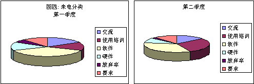 為什么單位設(shè)備來電會增加呢?如果把來電的原因(圖四)分為以下幾類:軟件、硬件、溝通、使用訓(xùn)練、要求、放棄,我們可能會注意到在其他項(xiàng)略有減少的同時(shí),使用訓(xùn)練從開始時(shí)的15%躍到第二季度的30%。當(dāng)然,和其他部門合作,這一問題是可以采取各種方式加以解決的。