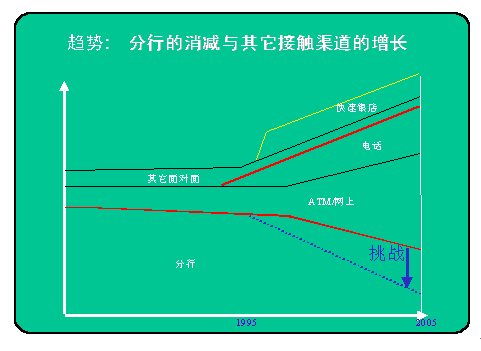 。。下圖為國外專家對銀行不同客戶服務(wù)渠道發(fā)展比例的說明?梢钥吹,營業(yè)廳的比例在逐年下降,而國外不少銀行甚至將進一步壓縮營業(yè)廳比例作為一項渠道的任務(wù)。電話銀行也就是通過IVR實現(xiàn)的自助服務(wù),自然是呼叫中心的一部分,但人工服務(wù),包括對上網(wǎng)及其它互動方式的客戶提供的座席代表服務(wù),當然更是現(xiàn)代呼叫中心業(yè)務(wù)的一部分,圖上雙紅線內(nèi)所表示的正是不斷發(fā)展的呼叫中心的所占比例。