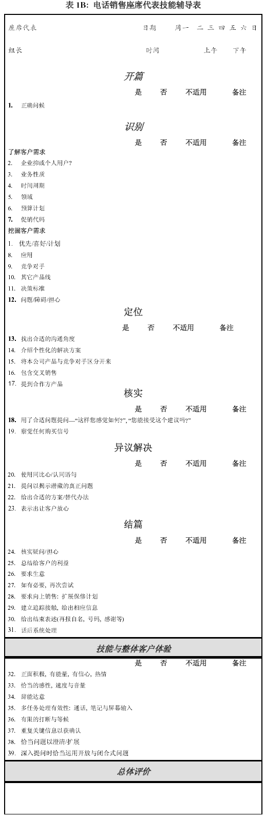 。。以上的表格主要是給從事客戶服務的座席代表使用,以下的表格是根據(jù)我自己使用過的對具電話營銷功能的座席代表輔導表改動而來。