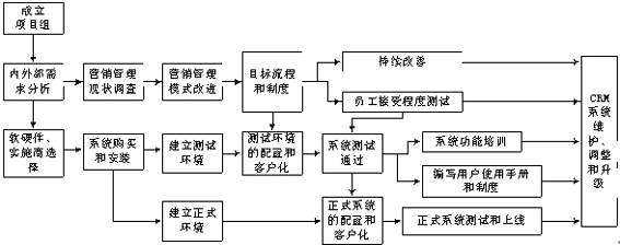 一個(gè)CRM系統(tǒng)的建設(shè)所經(jīng)過(guò)的歷程,可以用圖1所示。漢普管理咨詢(中國(guó))有限公司的CRM系統(tǒng)的實(shí)施就是按照這個(gè)路線進(jìn)行的,主要從管理的調(diào)整和信息系統(tǒng)的建設(shè)兩個(gè)方面著手。